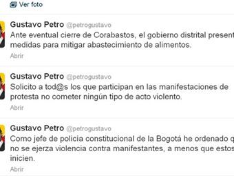 A través de su cuenta en Twitter, el alcalde de Bogotá pidió a todos los manifestantes que se han unido al paro agrario no cometer actos violentos y aseguró que ordenó a la Policía Metropolitana que no ejerza violencia contra manifestantes, a menos de que sean quienes protestan los que inicien disturbios