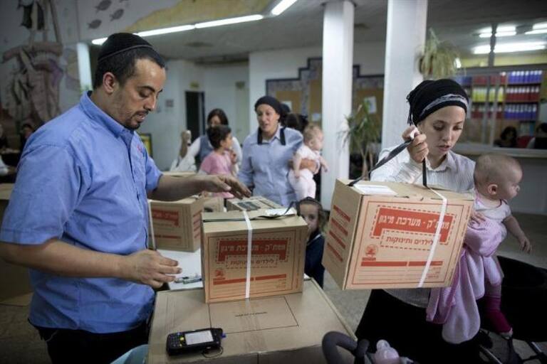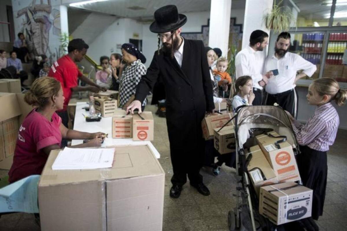 Un ultra-ortodoxo judío recoge una caja de máscaras de gas.