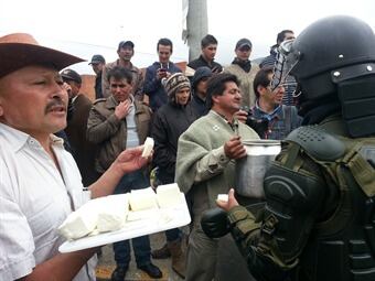 Como un gesto de solidaridad y paz, los campesinos le están dando a los policías antimotines, que permanecen custodiando la vía Bogotá-La Calera, agua de panela con queso.