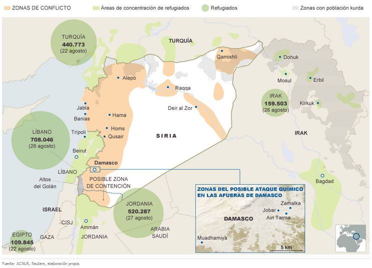 Áreas de concentración de refugiados desplazados desde Siria.
