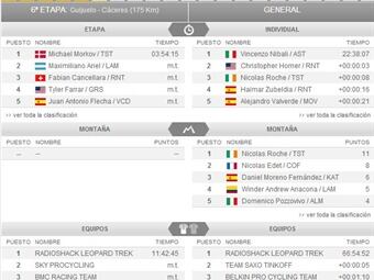 Tras la sexta etapa, no hubo variaciones entre los primeros de la clasificación general. Rigoberto Urán continúa en el séptimo lugar.