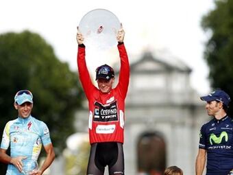 Horner, a punto de cumplir 42 años, subió al podio en la Plaza de Cibeles acompañado del italiano Vincenzo Nibali (Astana) y del español Alejandro Valverde (Movistar), segundo y tercero, respectivamente