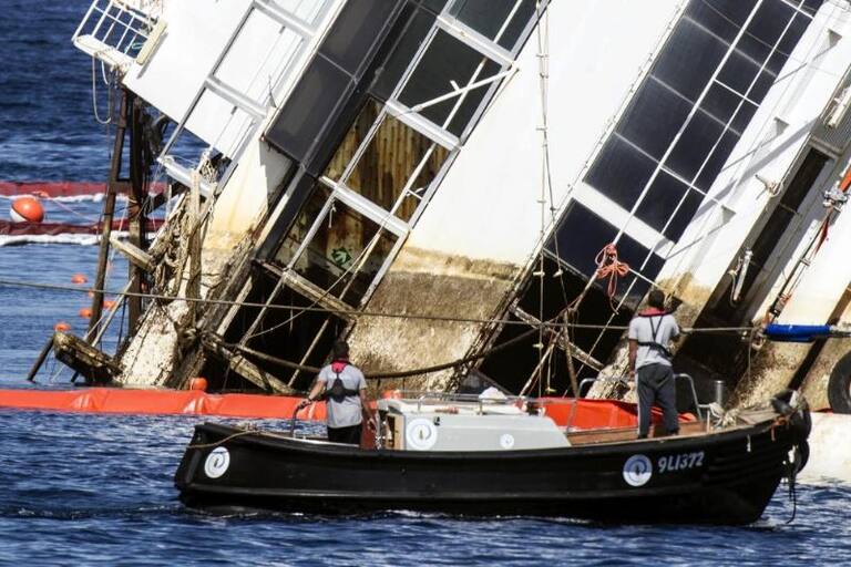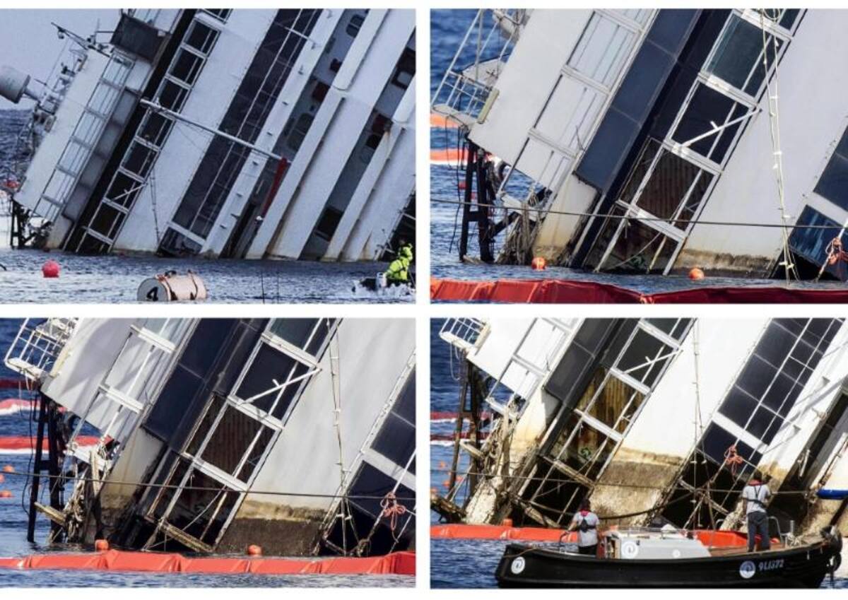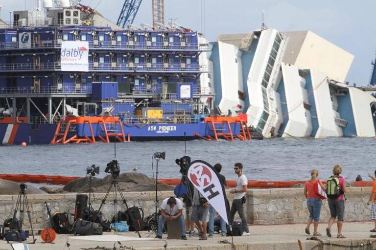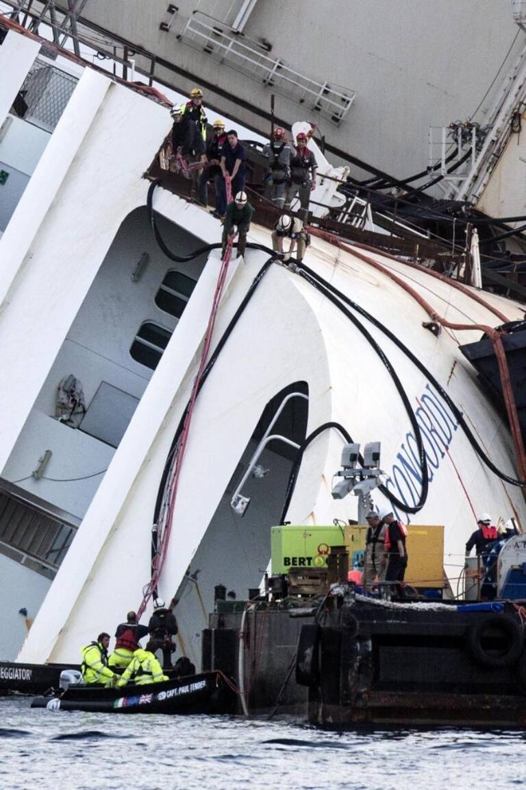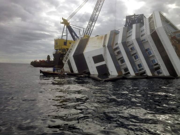 Operarios trabajan intentando enderezar el Costa Concordia en la isla de Giglio en Italia