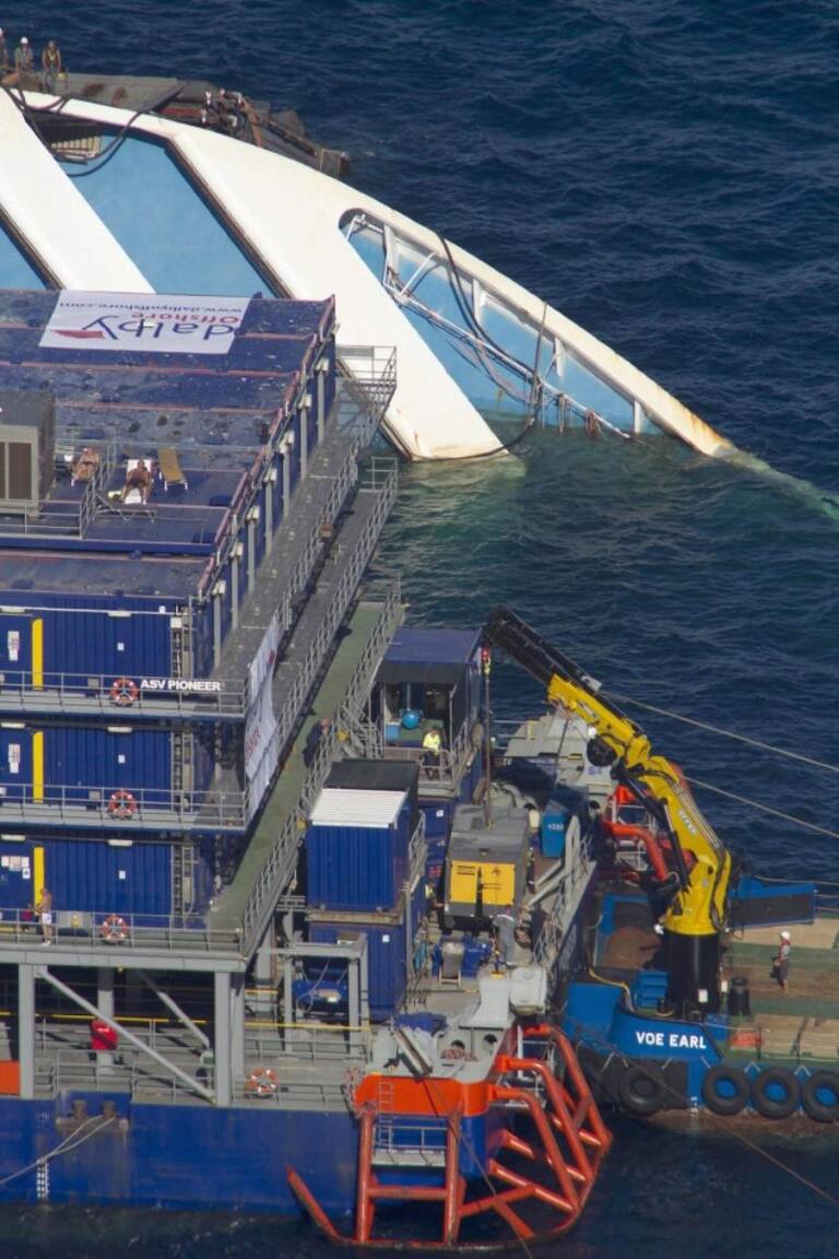 Operarios trabajan intentando enderezar el Costa Concordia en la isla de Giglio en Italia.