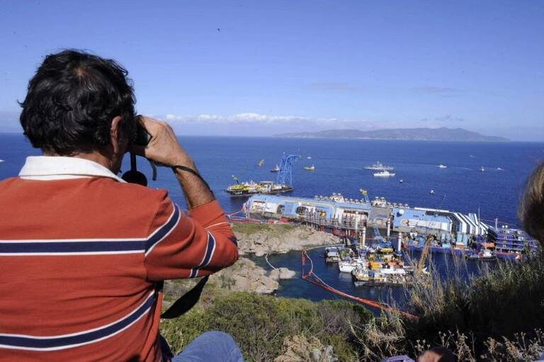 Un turista observa la operación de enderezamiento del Costa Concordia, el gigantesco crucero que hace 21 meses naufragó y causó la muerte de 32 personas