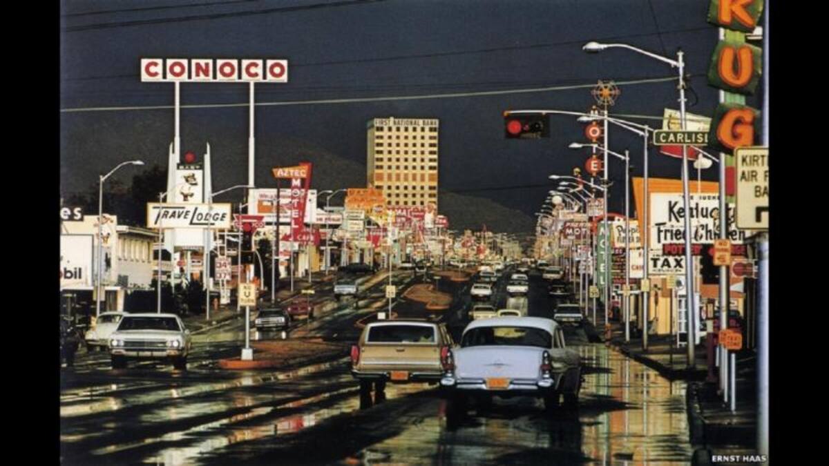 • La muestra, titulada "True Colors" ("Colores verdaderos") presenta una selección de obras de fotógrafos que han llevado este arte a extremos, desde los trabajos del fotógrafo austriaco Ernst Haas a mediados del siglo XX hasta experimentos más recientes. Esta imagen de Haas de 1969 se titula "Ruta 66, Alburquerque, NM".