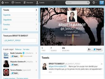 @B_BARDOT_PERSO es una cuenta en Twitter que abogará por los animales. Fue abierta por la actriz de cine francesa Brigitte Bardot, según indicó la fundación de defensa de los animales que lleva su nombre