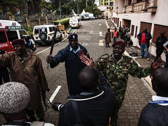 Miembros de la milicia radical islámica somalí Al Shabab permanecen en el interior del centro comercial asaltado, donde 56 horas después del comienzo del ataque todavía continúan mantienen a algunos rehenes.