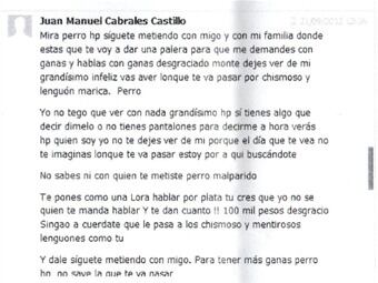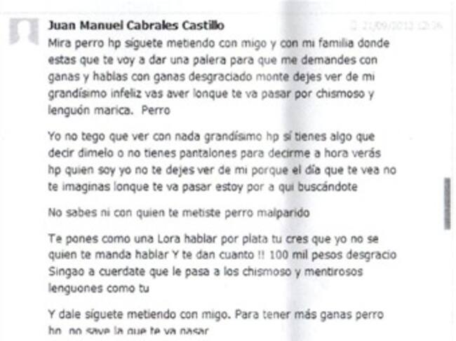 “Yo no tengo que ver con nada grandísimo hp si tienes algo que decir dímelo o no tienes pantalones para decirme a hora verás hp quien soy yo no te dejes ver de mi porque el día que te vea no te imaginas lo que te va pasar estoy por aquí buscándote”, dice en una de los apartes el mensaje en Facebook
