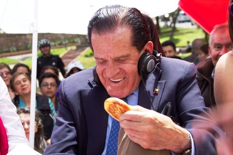 Hugo Patiño invitado del programa comiéndose una arepa boyacense
