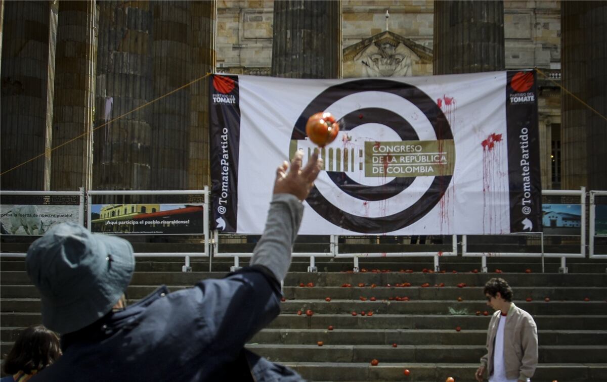 Manifestantes convocados por el Partido del Tomate, se dieron cita en la Plaza de Bolívar para lanzar tomates contra el Congreso de la Republica.