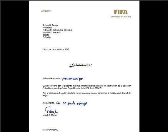 El presidente de FIFA, Joseph Blatter envió una carta a la Federación Colombiana de Fútbol donde envía felicitaciones a la selección por haber alcanzado la clasificación mundialista.