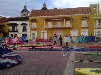 Aficionados a los deportes náuticos en Cartagena realizaron una singular manifestación en la Plaza de la Aduana frente a la Alcaldía para protestar por el desalojo de una escuela de surf que funcionaba en el balneario de la boquilla