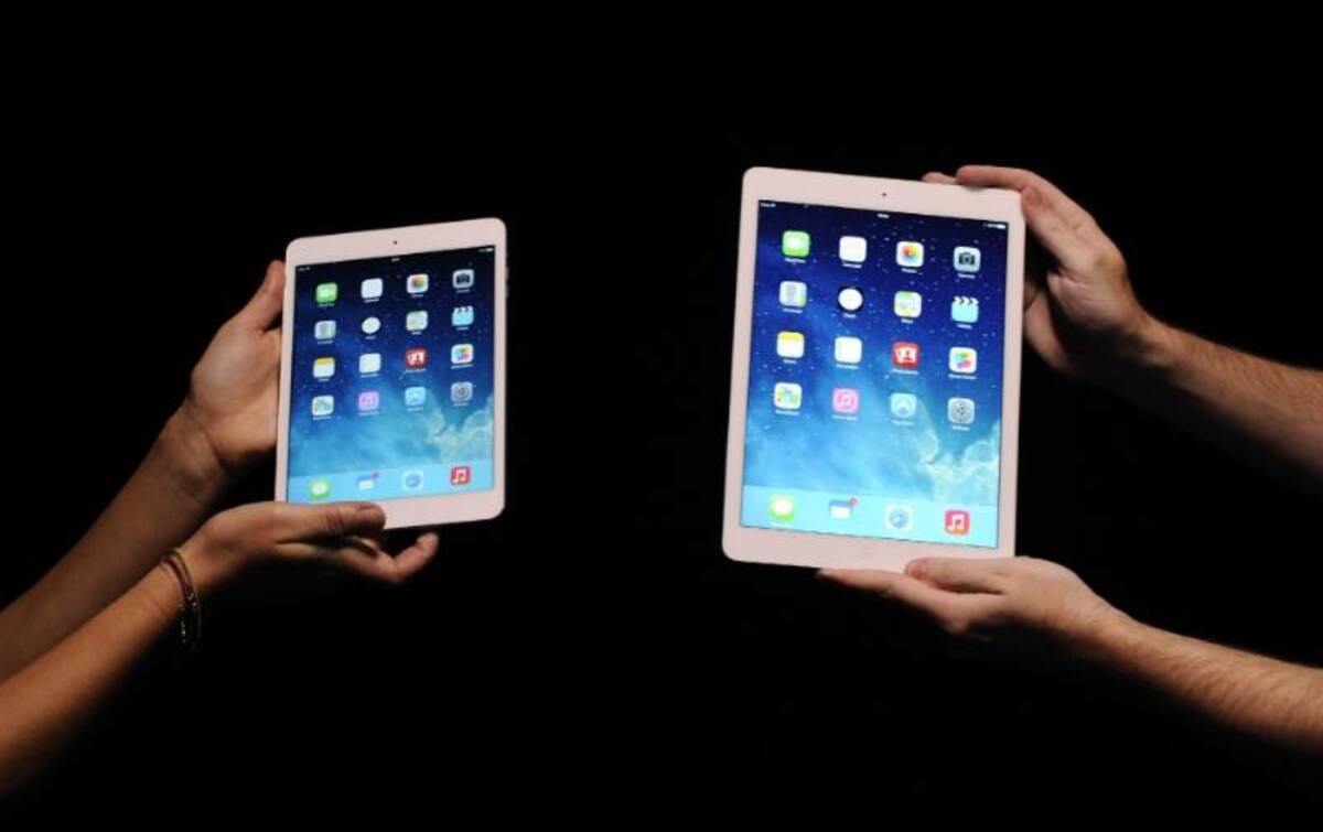 Empleados de Apple le muestra a periodistas de tecnología el nuevo iPad Air, en una tienda Apple en Londres, Reino Unido. Apple presenta las nuevas versiones de sus tabletas, iPad mini y iPad Air y ha dado un cambio a su política de "software", haciendo gratuito el nuevo sistema operativo para ordenadores Mac y, para nuevos clientes.