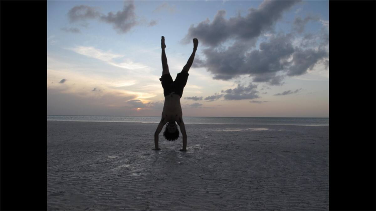 • Dos jóvenes ven el paisaje al revés, mientras realizan acrobacias en la "playa Esperanza" en Manatí, Puerto Rico. Foto: José Ayende Ruiz