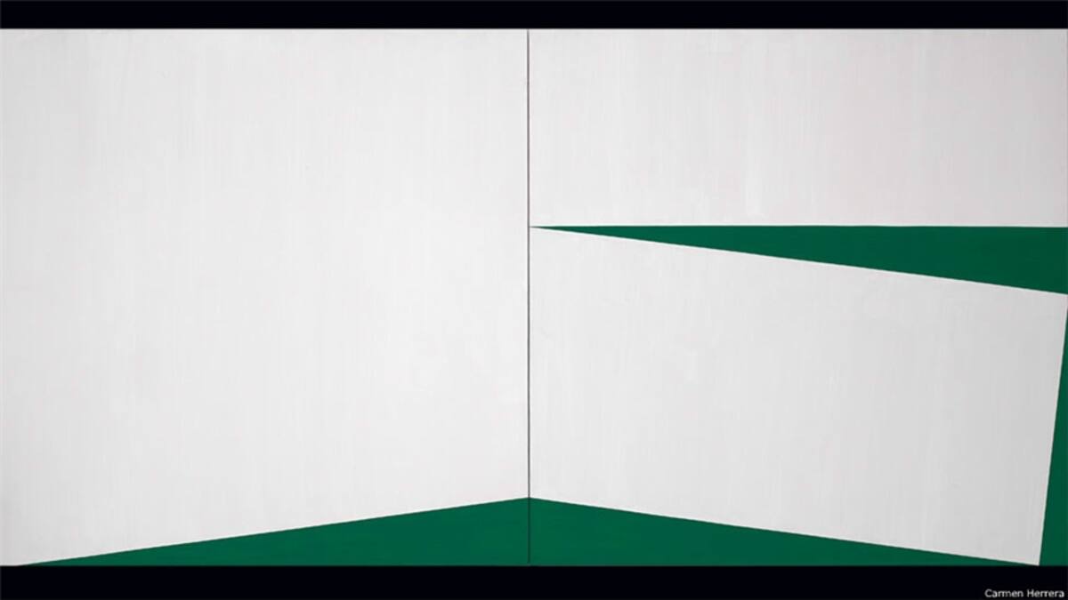 • "Somos conscientes de que nuestra colección hace una declaración sobre las fronteras del arte estadounidense", dijo la curadora, Carmen Ramos, durante una ceremonia de presentación en la que participó el corresponsal de BBC Mundo en Washington, Thomas Sparrow. La obra de la imagen, Blanco y Verde, pertenece a la cubana Carmen Herrera. La curadora dice que pese a que Herrera ha trabajado al lado de colegas estadounidenses y ha vivido en Estados Unidos por varias décadas, con frecuencia