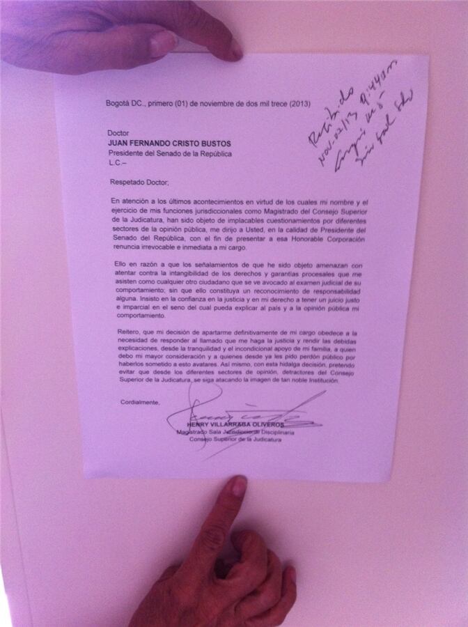 El jurista renunció este sábado ante la Secretaría del Senado al quedarse sin respaldo de las Altas Cortes.