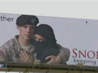 En un anuncio aparece un soldado estadounidense abrazado a una mujer musulmana con el rostro cubierto y que luce un anillo de casada