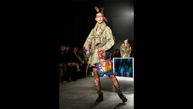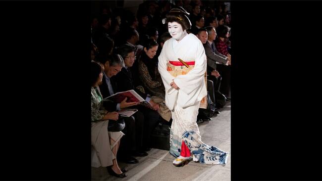 Foto 7 de 10"Moda en movimiento" presenta pasarelas de alta costura a un público más amplio, con el bello fondo del Museo. En esta imagen se aprecia a una persona de la audiencia vistiendo elementos tradicionales japoneses que se aprecian en el show.