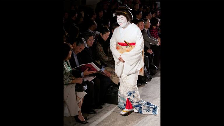 "Moda en movimiento" presenta pasarelas de alta costura a un público más amplio, con el bello fondo del Museo. En esta imagen se aprecia a una persona de la audiencia vistiendo elementos tradicionales japoneses que se aprecian en el show.