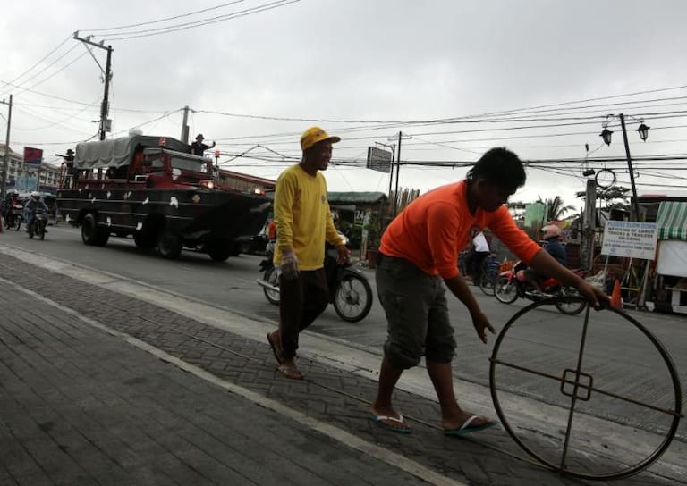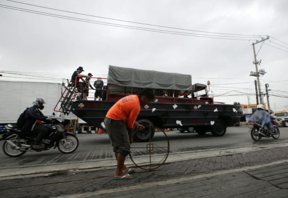 Un vehículo anfibio de rescate transita este por una calle de una aldea costera en Las Pinas, sur de Manila.
