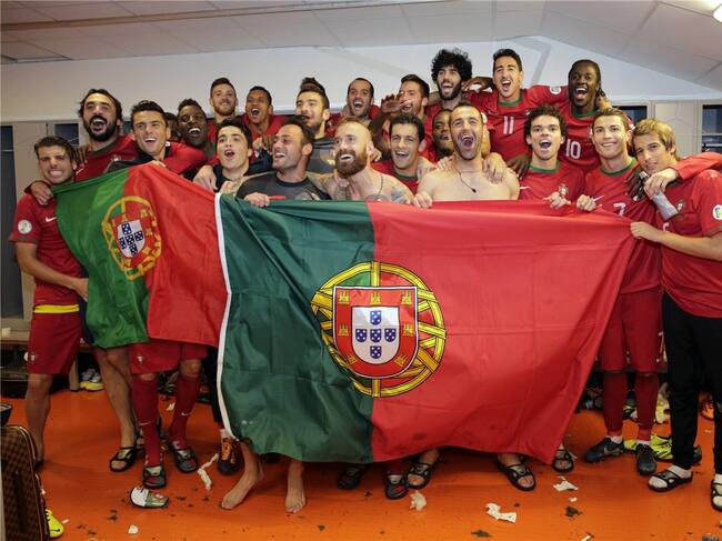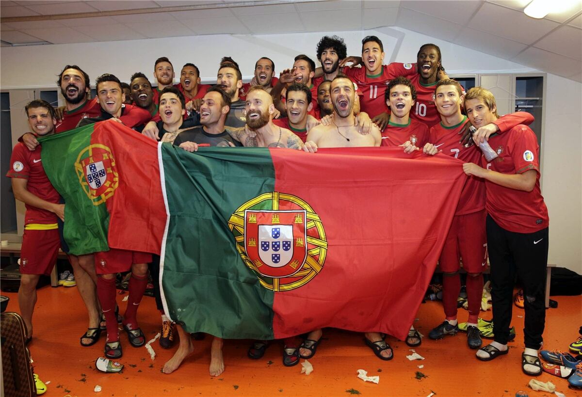 La Federación Portuguesa de fútbol facilitó esta fotografía en la que los jugadores celebran tras haber derrotado por un 4-2 global a Suecia en el repechaje.