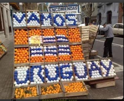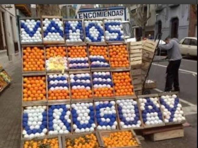 En una tienda de Montevideo, decidieron decorar con frutas en apoyo a Uruguay que juega ante Jordania el partido de vuelta del repechaje al Mundial. Foto vía Twitter: @CelesteeCorazon