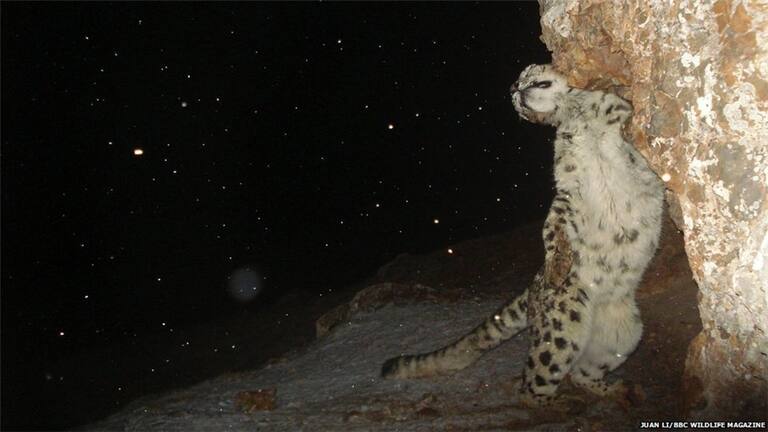 Este aparato ha sido muy efectivo para fotografiar animales raros o en peligro de extinción en su hábitat natural, como esta rara onza o irbis (Panthera uncia) que marcan su territorio en una roca en la meseta tibetana. La imagen ganó en la categoría "Mejor comportamiento animal".