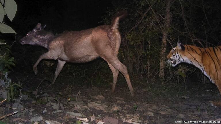 Las cámaras-trampa tambíén son efectivas para observar momentos que podrían ser muy peligrosos para el fotógrafo. Como esta imagen de un tigre cazando a un sambar, una especie de cérvido, en el norte de India.
