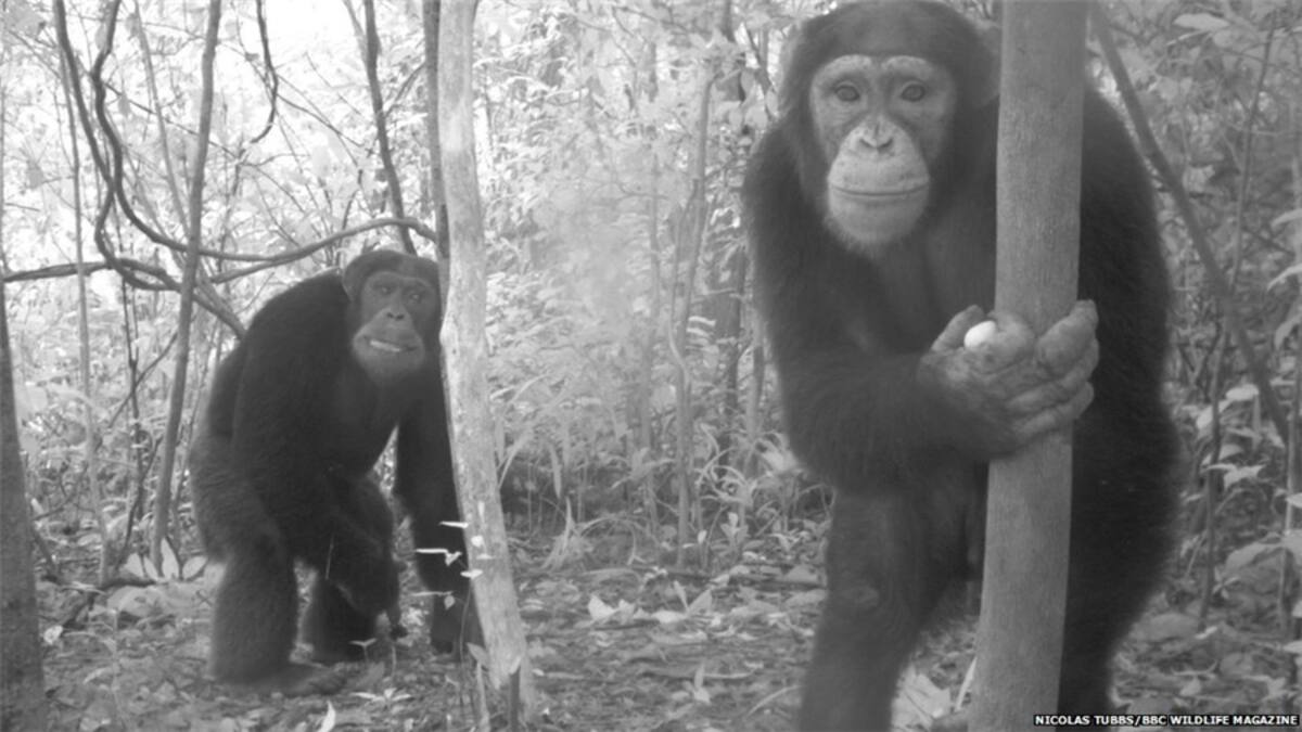 Las cámaras-trampa son máquinas fotográficas ubicadas en lugares remotos que sacan fotos cuando un sensor es activado, generalmente por el movimiento del animal. Estos dos chimpancés posaron ante la lente en Sierra Leona.