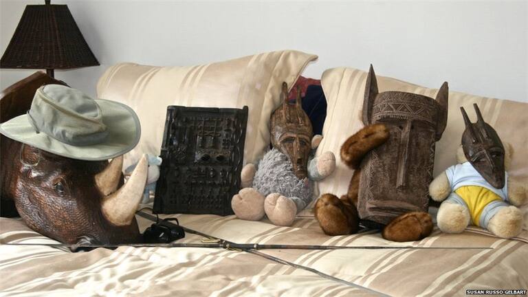 Una serie de máscaras descansando en una cama. Foto: Susan Russo Gelbart