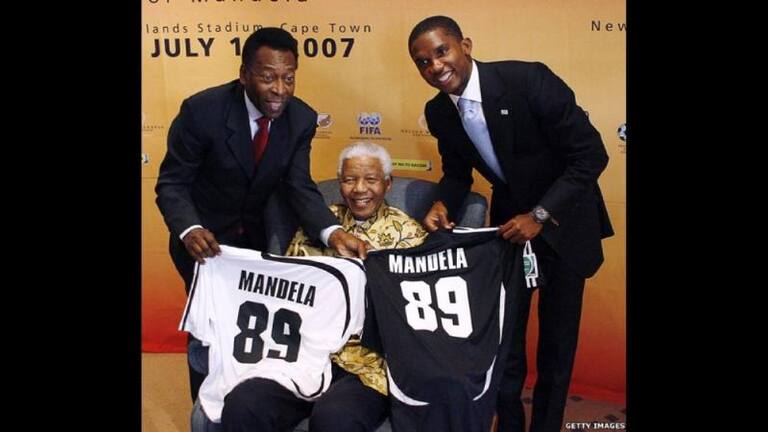 El fútbol siempre un factor que utilizó Mandela para unir a su país y darlo conocer en el mundo. La estrella brasileña Pelé y el camerunés Samuel Eto'o le regalan un par de camisetas durante la celebración de su cumpleaños número 89 en 2007