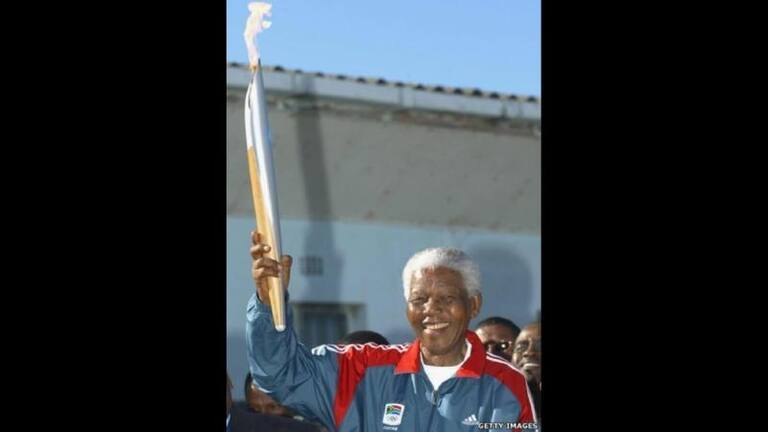 En uno de sus últimos actos: con la antorcha olímpica para Atenas 2004 en el lugar donde pasó 27 años de prisión, Robben Island. Ese año se retiró de la vida pública diciendo "no me llamen. Yo los llamaré".