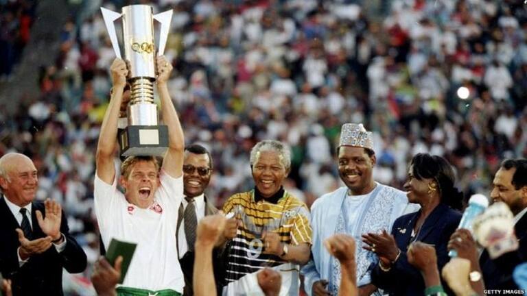 Un momento histórico para Sudáfrica: el entonces presidente Nelson Mandela le entrega el trofeo Web Ellis al capitán de la selección sudafricana de rugby, Francois Pieenar, después de ganar el Mundial de este deporte en 1995. Muchos calificaron este día como fundamental para la unión del país, dividido tras años de segregación racial.