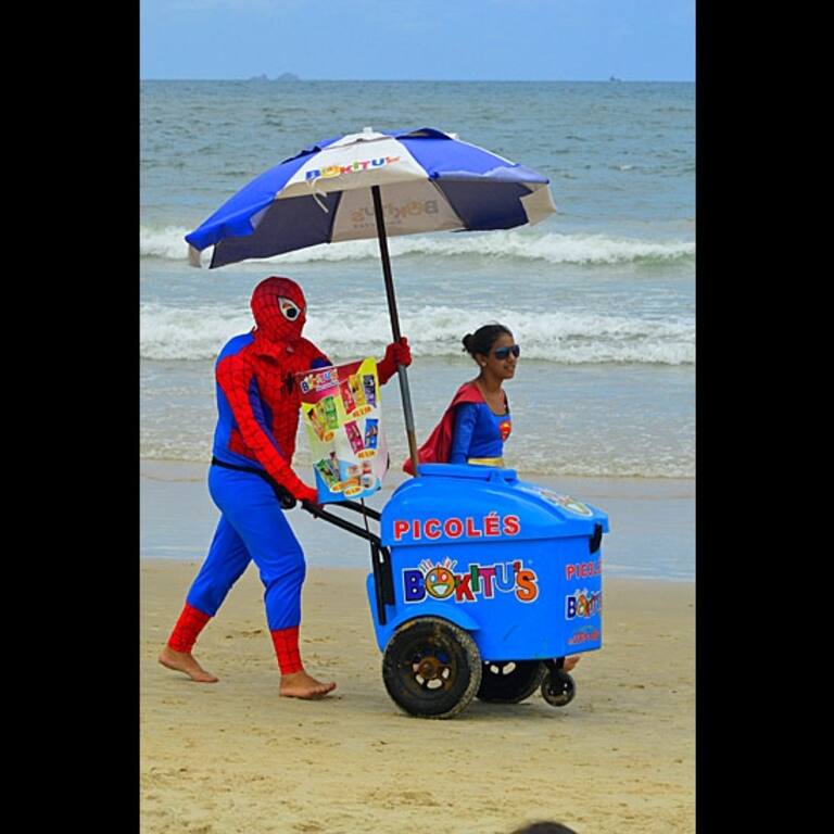Hernes Rodríguez opina que varias cosas pueden hacerse enmascarado, y pasar mucho calor. Entre ellas, vender helados disfrazado de Spiderman en una playa de Brasil.