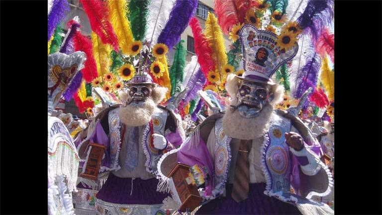 Máscaras de moreno usadas en las Entradas folklóricas de Bolivia que representan a los esclavos negros que llegaban a las minas de Potosí a principios de la colonia española. Foto: Rolando López T.