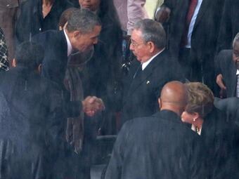 El breve apretón de manos supuso el primer encuentro documentado entre Obama y Castro, cuyos países carecen de relaciones diplomáticas desde 1961, y tuvo lugar cuando el mandatario estadounidense se dirigía hacia el estrado desde el cual habló a los miles de sudafricanos presentes en la ceremonia por Mandela. No se trata, sin embargo, de la primera vez que un presidente estadounidense estrecha la mano de uno de los hermanos Castro: en septiembre de 2000, Bill Clinton saludó al entonces mandatario cubano, Fidel Castro, si bien el encuentro se produjo lejos de las cámaras y no llegó a la prensa hasta más tarde. Poco después de saludar a Castro, Obama aprovechó su discurso para hacer una aparente crítica al régimen cubano, entre otros. "Hay demasiados líderes que aseguran ser solidarios con la lucha por la libertad de Madiba (apelativo cariñoso de Mandela), pero no toleran la disidencia en su propio pueblo", señaló Obama. El citado funcionario de la Casa Blanca recordó esa frase de Obama y señaló que Estados Unidos "urge a los líderes mundiales a honrar la lucha de Mandela por la libertad al garantizar los derechos humanos básicos de su pueblo". Castro, por su parte, calificó el apretón de manos como algo "normal", de gente "civilizada", en una breve entrevista