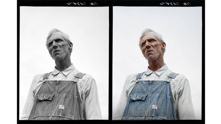 Para colorear las imágenes se pinta digitalmente sobre una fotografía monocroma. Esta técnica es una versión actualizada de la pintura manual, que era un proceso muy laborioso. Según Jordan Lloyd, se deben superponer diferentes capas para lograr dar la impresión de realidad. (Foto en blanco y negro tomada en 1939 por Dorothea Lange, cortesía de la Librería del Congreso de EE.UU. / Foto en color: Jordan J. Lloyd / Dynamichrome).