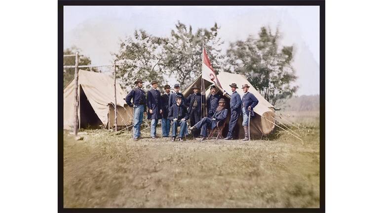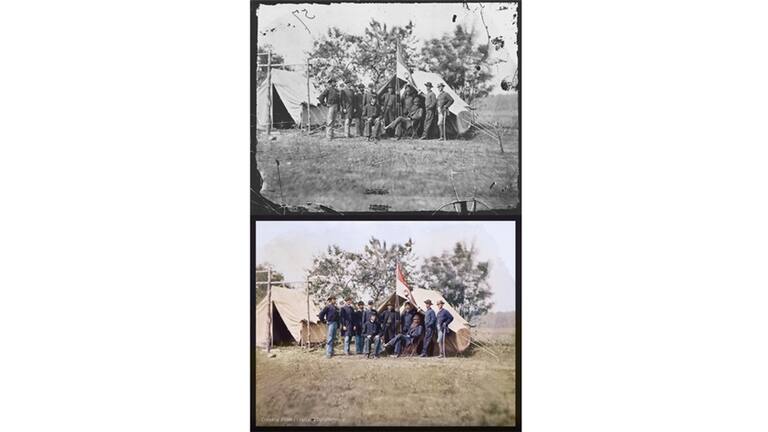 Una vez se ha aplicado el color, se utilizan diversas técnicas para que el fondo de la imagen se funda con los elementos coloreados. Dependiendo de lo compleja que sea la imagen el proceso puede llevar hasta una semana. (Foto en blanco y negro tomada en 1862 por Mathew Brady, cortesía de los Archivos Nacionales de EE.UU. / Foto en color: Jordan J. Lloyd / Dynamichrome).