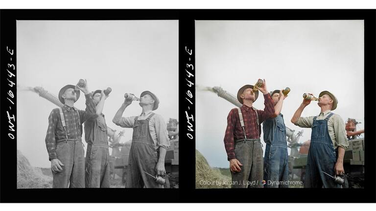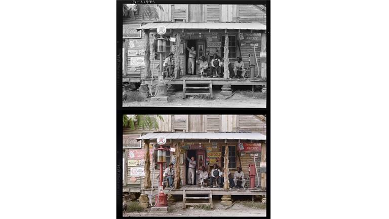 La cantidad de trabajo que debe invertirse en colorear las fotografías hace que la paciencia sea fundamental. (Foto en blanco y negro cortesía de la Librería del Congreso de EE.UU. / Foto en color: Jordan J. Lloyd / Dynamichrome).