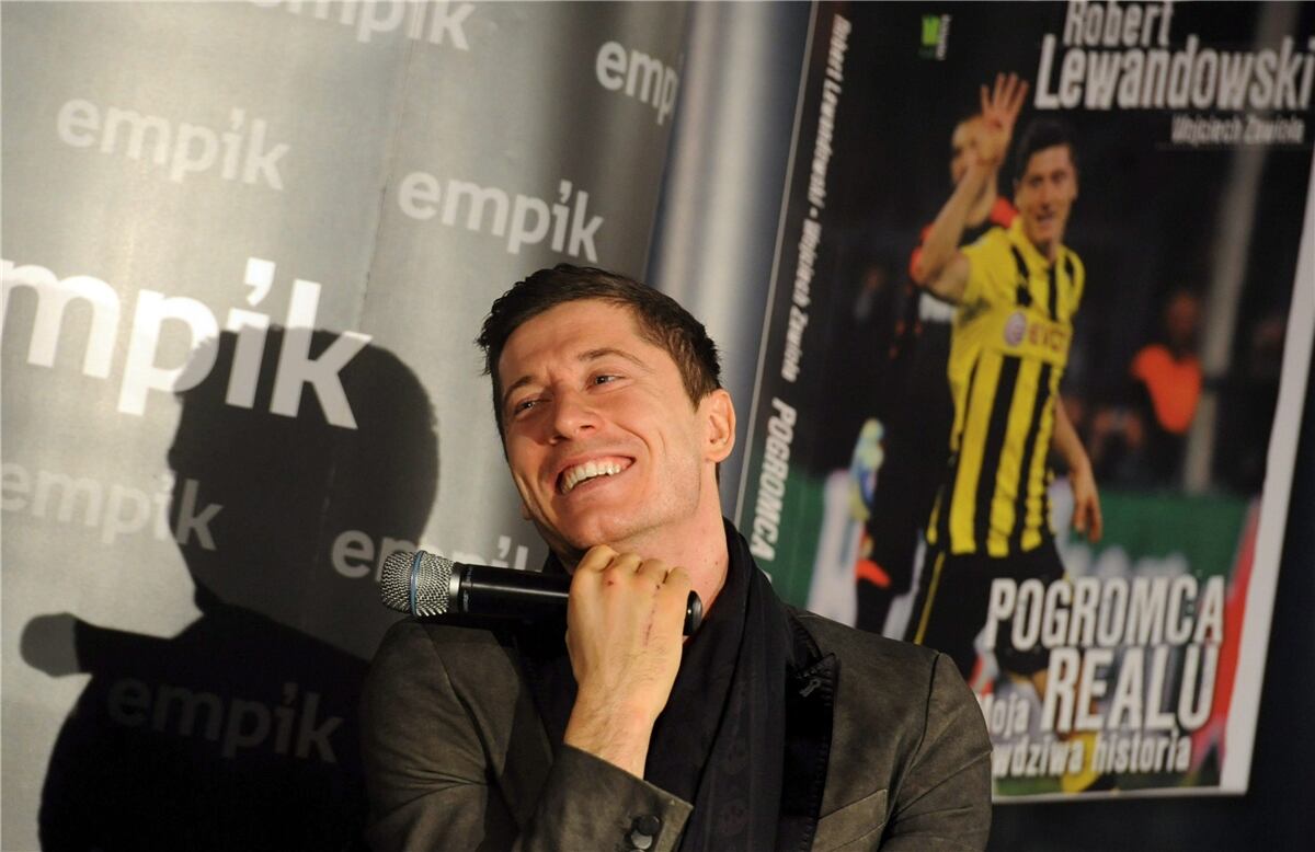 El futbolista polaco Robert Lewandowski durante la presentación de su biografía "Pogromca Realu. Moja prawdziwa historia" (La Matanza del Real Madrid. Mi Historia Real), escrita por Wojciech Zawiola.