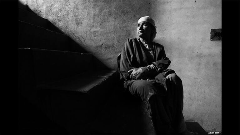 Las fotos de Abid Bhat documentan una cruda realidad en la región de Cachemira administrada por India. Allí hay muchas mujeres como Haleema Begum (en esta imagen) cuyos esposos han desaparecido pero no han sido declarados muertos. Los hombres fueron supuestamente detenidos por las fuerzas de seguridad que combaten a milicias separatistas en un conflicto que, según activistas, es notorio por las violaciones a los derechos humanos. La gente en Cachemira se refiere a estas mujeres como "semivi