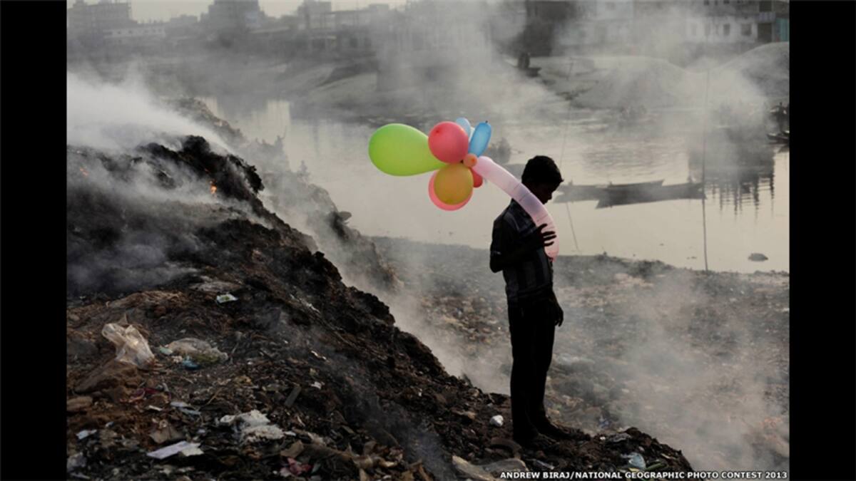 Esta foto de Andres Biraj muestra a un niño jugando al atardecer con globos al lado del río Buriganga. Se encuentra en medio de un vertedero humeante en Dhaka, Bangladesh.