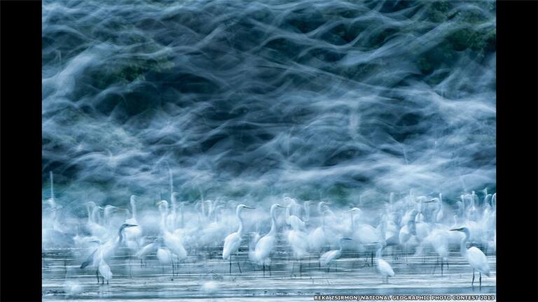 La tercera imagen en la categoría Naturaleza que mereció una mención de honor fue esta foto de Réka Zsirmon de grandes garcillas (Ardea alba) en el río Danubio, en Hungría.