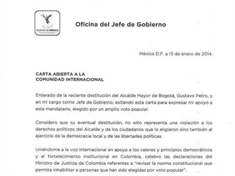 Miguel Ángel Mancera envió una carta abierta a la comunidad internacional expresando su apoyo a Gustavo Petro por considerar que su destitución “es una violación a los derechos políticos del Alcalde y de los ciudadanos que lo eligieron”