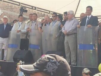 Los ciudadanos del municipio también se organizaron para mostrar rechazo frente a su tarima y su círculo de seguridad tuvo que protegerlo