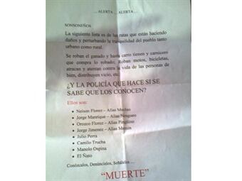 “La siguiente lista de ratas que están haciendo daños y perturban la tranquilidad del pueblo tanto urbano como rural. Se roban ganado y hasta carro, y tienen carnicero que compra lo robado, roban bicicletas, atracan, distribuyen vicio y atentan contra la vida de los ciudadanos” señala el panfleto
