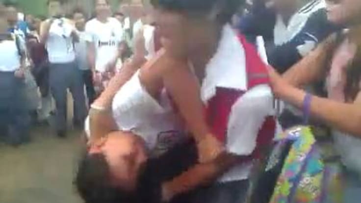 Comenzó a rodar un video en el que dos niñas de diferentes colegios se golpean en frente de varios estudiantes.