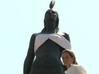 El cubrimiento de los senos de la India Catalina duró menos de un minuto, los suficientes para que un par de policías obligaran a bajar a la mujer de la estatua para que volviera a dejar al descubierto sus atributos.
