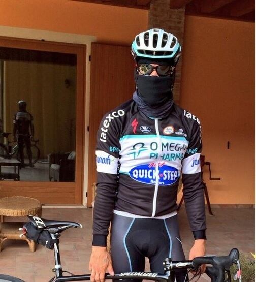El ciclista colombiano del Omega Pharma se cubre para entrenar y contrarrestar el frío. Irreconocible!